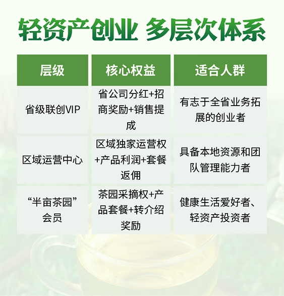 在合作模式上,山茶润构建了轻资产创业、多层次参与的共赢体系。针对有志于开拓全省业务的创业者,设有省级联创VIP层级,可享省公司分红、招商奖励及销售提成;对于具备本地资源与团队管理能力的伙伴,可申请成为区域运营中心,获得区域独家运营权、产品利润及套餐返佣;而对于广大的健康生活爱好者与轻资产投资者,则提供“半亩茶园”会员模式,享有茶园权益、产品套餐及转介绍奖励。