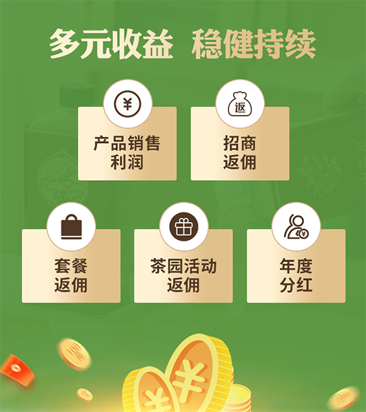 合作伙伴可以享有来自多个维度的收益,包括直接的产品销售利润、招商推广返佣、特色套餐销售返佣、茶园主题活动返佣以及可能的年度分红,构建起稳健且持续的收益结构。