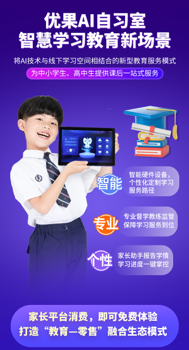 优果AI自习室作为关键场景,融合智能硬件与专业服务。配备AI学习机实现个性化学习路径规划,并由专业督学团队提供伴学督导、作业辅导等全方位服务。家长可通过专属APP实时掌握学情,有效参与孩子的学习成长过程。