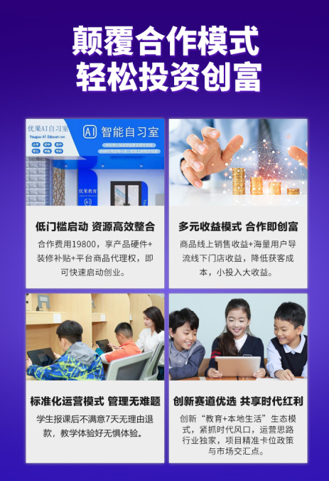 对于合作者而言,平台提供从品牌授权、设备技术、运营支持到AI自习室营建的全链条扶持。轻量化的启动模式降低了创业门槛,而多元收益来源则提升了经营稳定性。总部在营销推广、赋能培训等方面持续赋能,助力合作伙伴快速落地并实现良性运转。