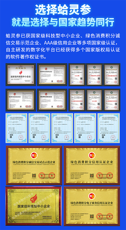 2.资质认证背书:蛤灵参(吉林)生鲜连锁超市有限公司已荣获由国家级行业协会和信用机构颁发的“绿色消费积分诚信交易试点示范企业”、“绿色消费积分信用认证企业”等多项认证。这些认证并非花钱可得,而是需要经过严格的资料审核、模式论证和实地考察,证明其积分体系设计合理、运营规范、符合政策导向。这好比获得了官方的“合规经营许可证”。