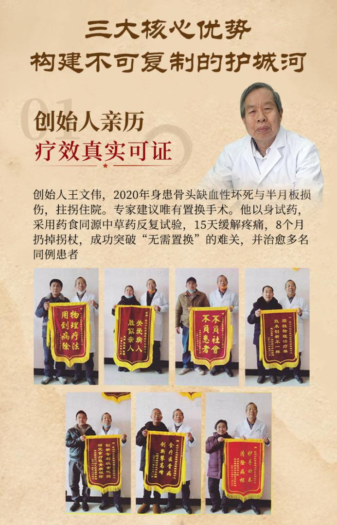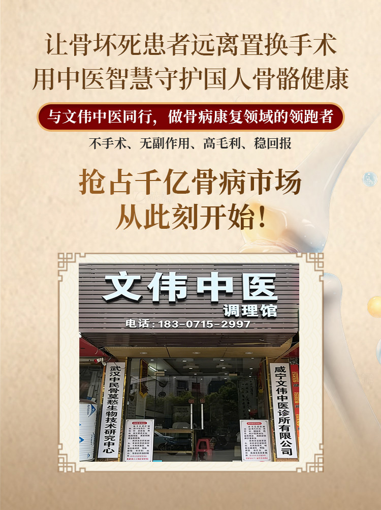 正是在这样的行业背景下,文伟中医以创始人亲身验证的“药食同源”内服方药为核心,切入骨病调理市场。项目的起点,是一段真实且震撼的个人经历。创始人王文伟,1993年就职于武汉华中医药保健食品研究所,深耕骨科物理治疗与食疗研究多年。2020年4月,他被确诊为双侧股骨头缺血性坏死和半月板损伤,拄拐住院,专家建议进行关节置换。不甘心的他尝试了国药集团生产的专用中药,加量服用60天未见好转。最终,他依托多年专业积累,筛选卫健委颁布的药食同源中草药,以身试药反复试验。半个月后疼痛缓解,八个月后成功丢掉拐杖。这段从患者到研发者的经历,成为文伟中医最真实的产品背书。
