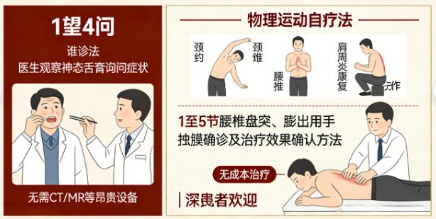 文伟中医的差异化竞争力,还体现在其独特的诊断与康复体系上。创始人独创的“1望4问”确诊法,无需依赖CT、MRI等昂贵设备,即可精准判断病情。针对颈椎、腰椎、肩周炎等常见问题,开发了物理运动自疗法,特别是1至5节腰椎盘突、膨出的用手触摸确诊及治疗效果确认方法,无成本治疗,深受患者欢迎。这套“零成本引流”模式,让合作方无需高额推广费用,就能通过免费体验吸引客户到店,再通过核心产品实现转化。