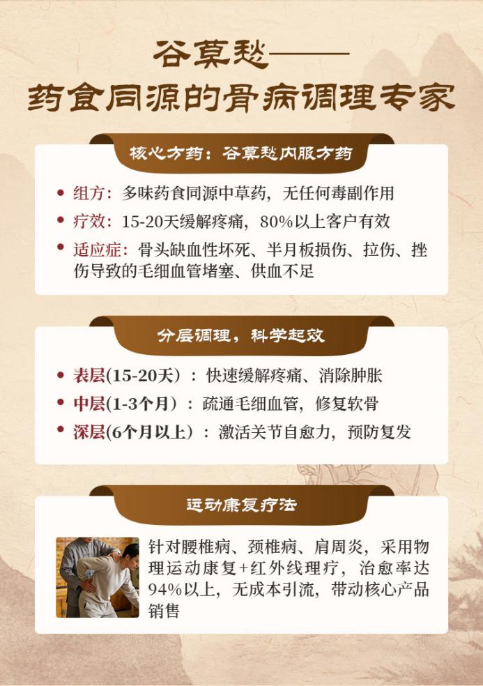 文伟中医的核心产品“谷莫愁”内服方药,采用20多味药食同源中草药配伍而成。与市面常见的骨病产品不同,“谷莫愁”不追求速效止痛,而是遵循中医“整体调理、标本兼治”的理念。其治疗原理被总结为“三通一修”:通血管、通经络、通代谢、修软骨。依据现有病例显示,15至20天即可缓解疼痛,80%以上客户有效缓解。产品经权威检测,不含激素、防腐剂、止疼成分,适合老年体弱、术后康复、慢性病患者长期服用。从成本角度看,全年调理费用不到关节置换手术的十分之一,形成了显著的价格优势。