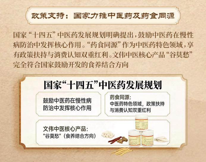 政策层面同样释放积极信号。国家“十四五”中医药发展规划明确提出,鼓励中医药在慢性病防治中发挥核心作用。“药食同源”作为中医药特色领域,享有政策扶持与消费认知双重红利。文伟中医核心产品“谷莫愁”完全符合国家鼓励开发的食养结合方向。目前,项目已获得多项专利和商标注册,并获央视《大国品牌故事》栏目重点提名。