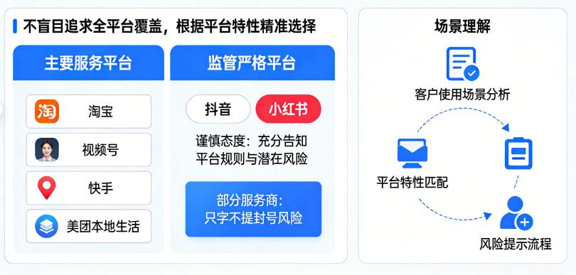 合规的第三道防线,是对客户使用场景的深度理解。天牧智播不盲目追求所有平台全覆盖,而是根据平台特性精准选择。目前服务最多的平台是淘宝、视频号、快手以及美团本地生活板块。对于抖音和小红书这类对AI数字人直播监管较为严格的平台,天牧智播采取谨慎态度,充分告知客户平台规则和潜在风险,而不是像某些服务商那样“只字不提封号风险”。