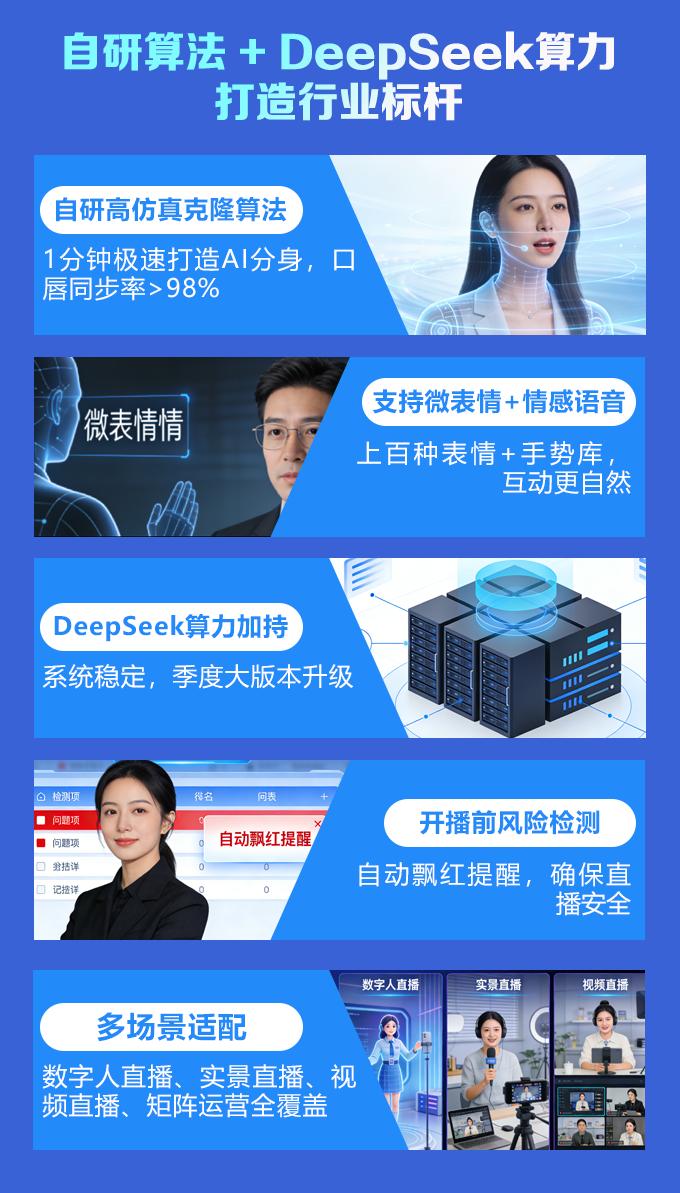 合规的第二道防线,是技术的自主可控。天牧智播的核心算法完全自研,拥有多项技术专利。自研高仿真数字人克隆算法,口唇同步准确率超过98%,支持上百种微表情和情感化语音。这与市面上那些使用通用API接口、口型匹配度低、形象僵硬的“套壳”软件形成了本质区别。底层算力由DeepSeek提供,每季度进行一次大版本升级,确保系统的稳定性和迭代速度。