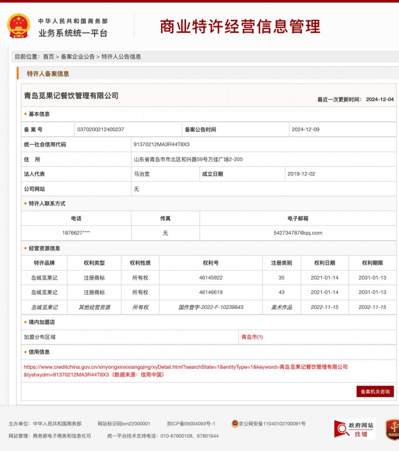 (图片说明:“觅果记商业特许经营备案信息”)