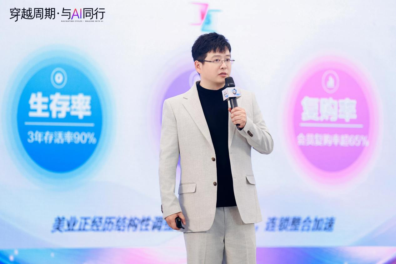 “美业正在经历结构性洗牌。”集团加盟事业部负责人袁冬冬在《解码加盟,共享品牌穿越周期》的主题演讲中,用一组对比数据点燃了全场关注:行业单店一年存活率约53%,三年存活率仅剩30%;而连锁加盟品牌一年存活率高达87%,三年仍能维持在60%。传统美容院闭店率高达42%,老店客户流失率可达70%。