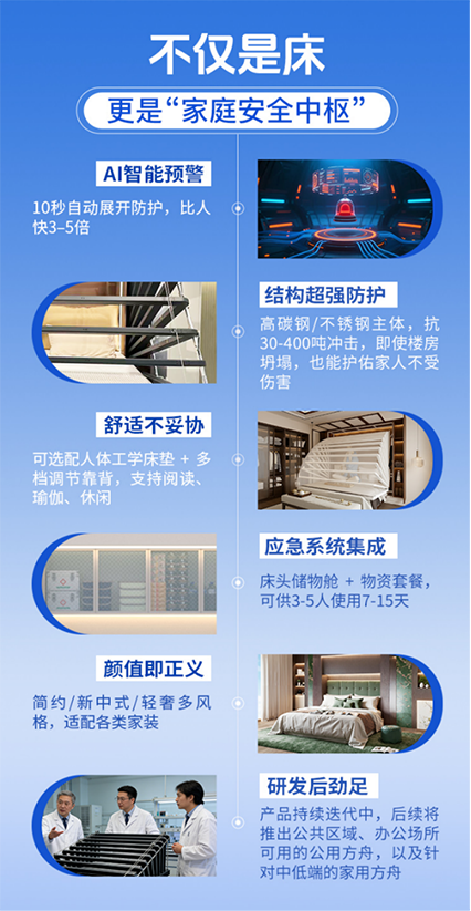 半年后的一天深夜,一场4.5级地震突然袭来。林女士一家在睡梦中被轻微的摇晃惊醒,但几乎是在同一时间,床体发出了一声轻响,随后自动展开的防护拱架将一家人稳稳地保护起来。等到震动结束,她才发现客厅的吊灯已经掉在地上,书柜也倒在了床边的位置。如果那天晚上没有这张床,后果不堪设想。
