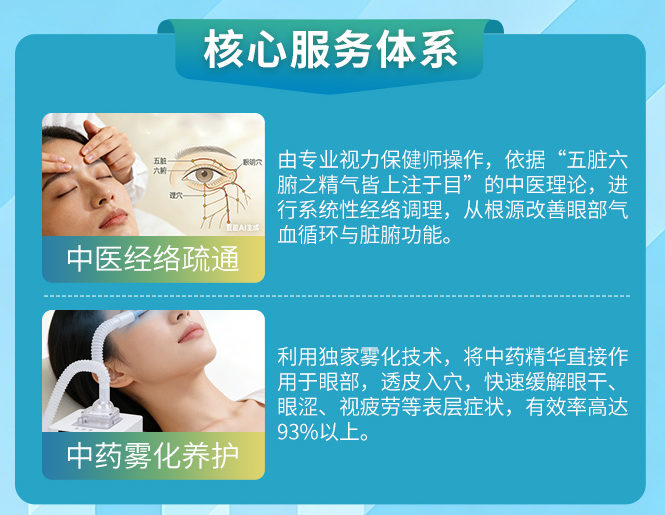 2.治标之术——中药雾化:利用现代雾化技术,将精选千里光、决明子、野菊花等药食同源药材的萃取精华,直接气化作用于眼部。此技术能透皮入穴,快速缓解干、涩、痒、胀等表层症状,有效率达93%以上,让顾客即时感受到改善,增强信任。