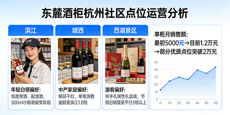 在杭州,东麓酒柜是最早进入社区的点位之一。运营团队发现,不同区域的消费偏好差异明显:滨江的年轻白领更喜欢低度果酒和起泡酒,300ml小瓶装最受欢迎;城西的中产家庭则对精品干红接受度更高,单笔消费金额是滨江的1.8倍;西湖景区的游客偏好伴手礼属性的礼盒装,节假日销量是平日的3倍以上。基于这些洞察,东麓优化了选品策略,甚至为不同点位定制了酒单。这种精细化运营,让杭州市场的单柜月销售额从最初的5000元稳步攀升至目前的1.2万元,部分优质点位突破2万元。